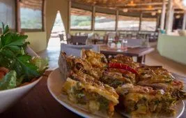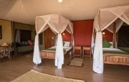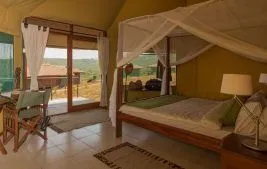 Furthermore, all rooms provide views of the forest, open fields, and distant hills. Local fabrics and hardwood furniture enhance the natural style, while mosquito nets cover each bed. The lodge supplies full amenities, and solar power runs all rooms, including solar-heated water and charging outlets for devices.