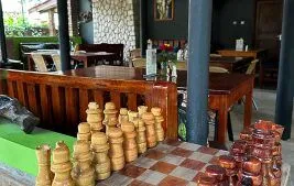 We offer 28 clean and comfortable rooms, each with an en-suite bathroom, satellite TV, safes, fans, mosquito nets, soap, shower gel, shampoo, and kettles with coffee and tea. The rooms include a mix of singles, doubles, twins, triples, and one quadruple. All rooms are set in a garden environment and feature outdoor seating areas. Our accommodations are rustic, focusing on clean, comfortable, and affordable lodging with a unique atmosphere.