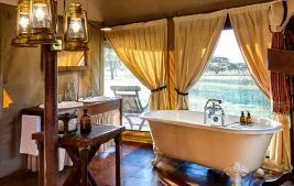 Singita Sabora Tented Camp features 9 en-suite tents, each elegantly furnished with a collection of antiques, original campaign furniture, Zanzibari chests, Persian rugs, and an array of crystal, silverware, and brass.
